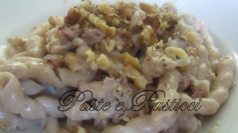 Fate imbiondire la cipolla a pezzetti nell’olio, unite la salsiccia spellata e fate rosolare, non c’è bisogno di salare o pepare perché la salsiccia è già saporita di suo. Sfumate con il vino e fate cuocere per 10 minuti,aggiungere metà gorgonzola e fate sciogliere. Lessare la pasta e mantecarla nella padella aggiungendo il resto del gorgonzola e un pò d’acqua di cottura se ce ne fosse bisogno. Servire cospargendo con le noci tritate.